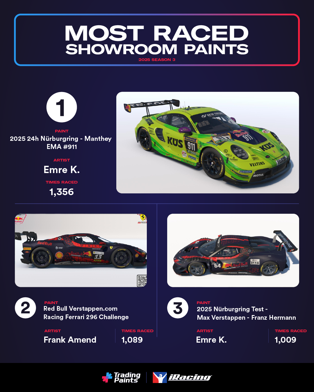 It’s another big season for painter Emre K! This replica of Manthey EMA’s Nürburgring Porsche 911 GT3 R (992) was the most-raced Showroom paint in Season 3.