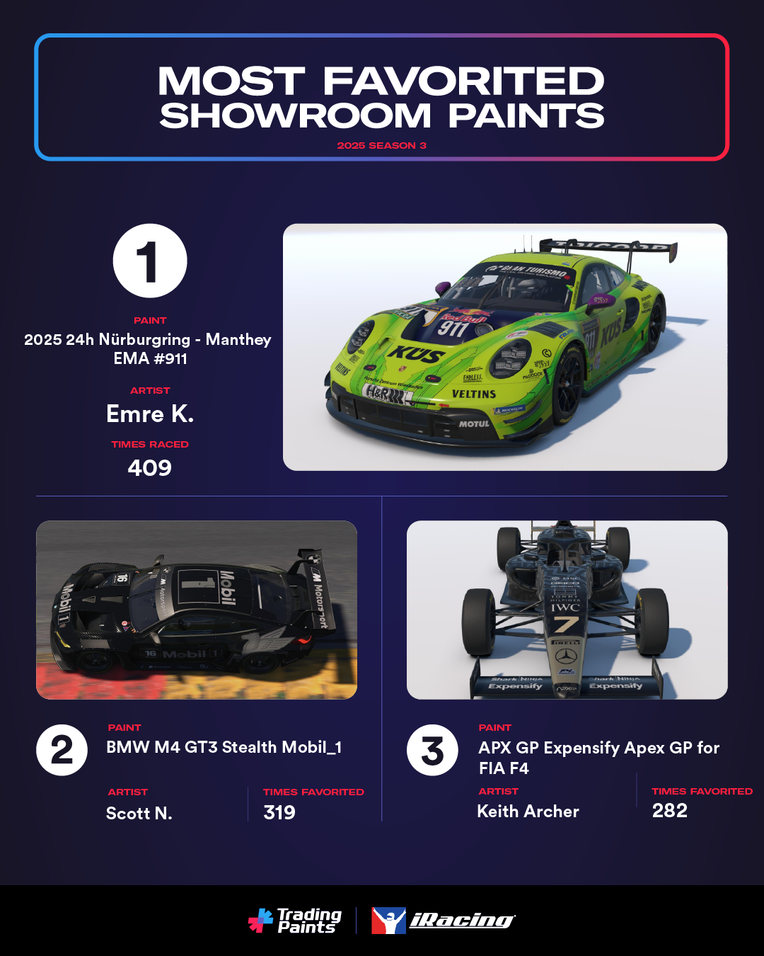 Most-raced paint, Emre K.’s Manthey EMA Nürburgring Porsche 911 GT3 R (992) replica was also the most favorited in Season 3, ahead of Scott N.’s stealthy BMW M4 GT3. This Sonny Hayes-inspired FIA F4 from Keith Archer racked up the third-most favorites last season.