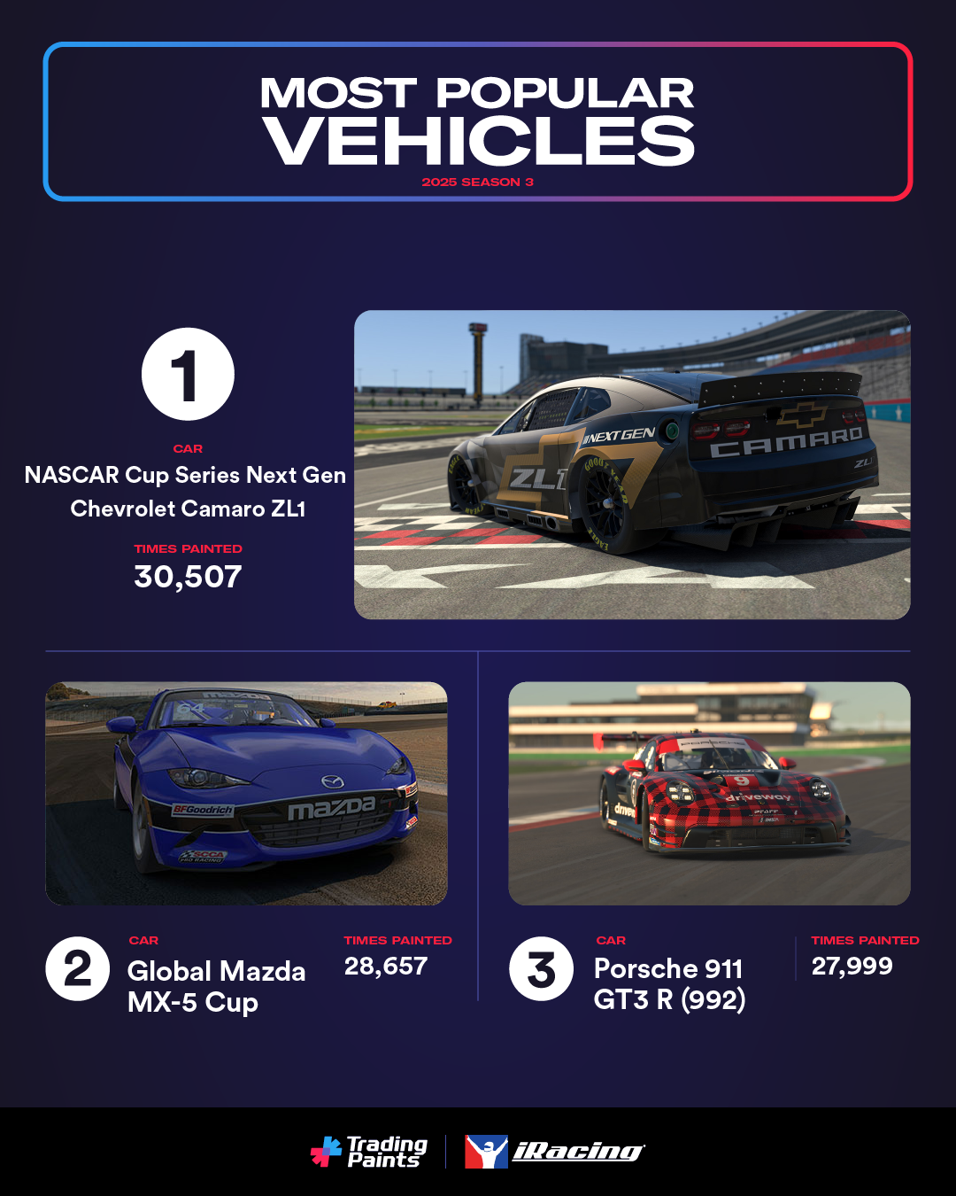 The mighty NASCAR Cup Series Next Gen Chevrolet Camaro ZL1, entry-level fave Global Mazda MX-5 Cup, and the Porsche 911 GT3 R (992) were the most-painted cars in Season 3. The trio combined for some 87,163 paints in the season.