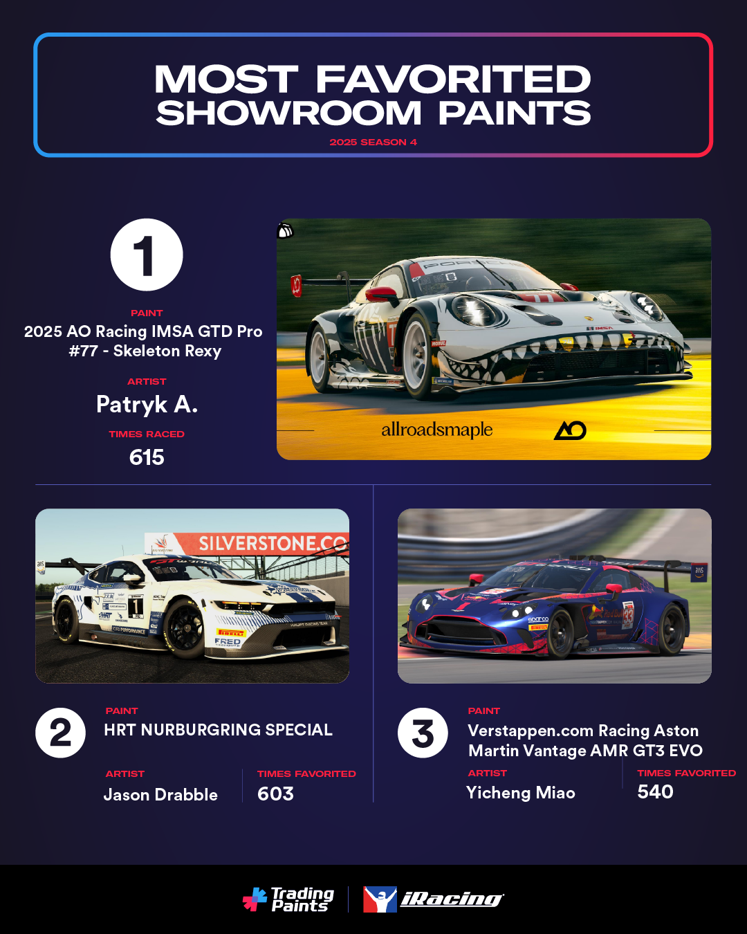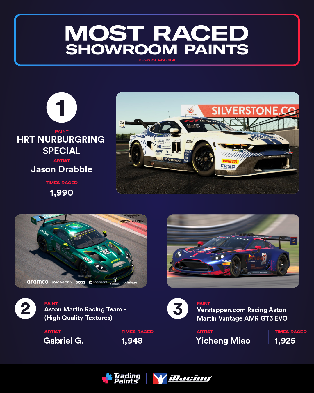 Jason Drabble’s HRT NURBURGRING SPECIAL upload was the most-raced paint from the Showroom in Season 4, totaling just under 2,000 instances raced.