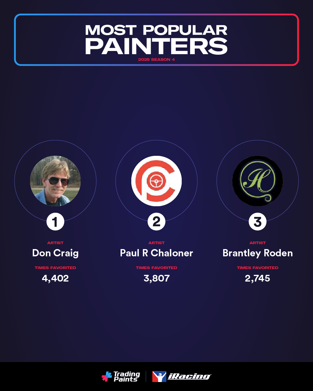 The venerable Don Craig and Paul R Chaloner swapped top spots from Season 3, followed by Brantley Roden earning a spot on the top-painters podium in Season 4 as well.