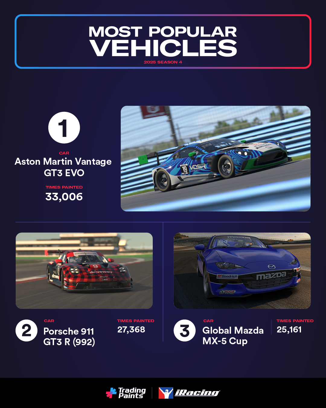 The new Aston Martin Vantage GT3 EVO was a popular car to paint, racking up 33,006 total custom paints in its debut season. The Porsche 911 GT3 R (992) followed closely behind with 27,368 new custom paints, with the podium-frequenting Global Mazda MX5-Cup in third with 25,161 paints assigned.