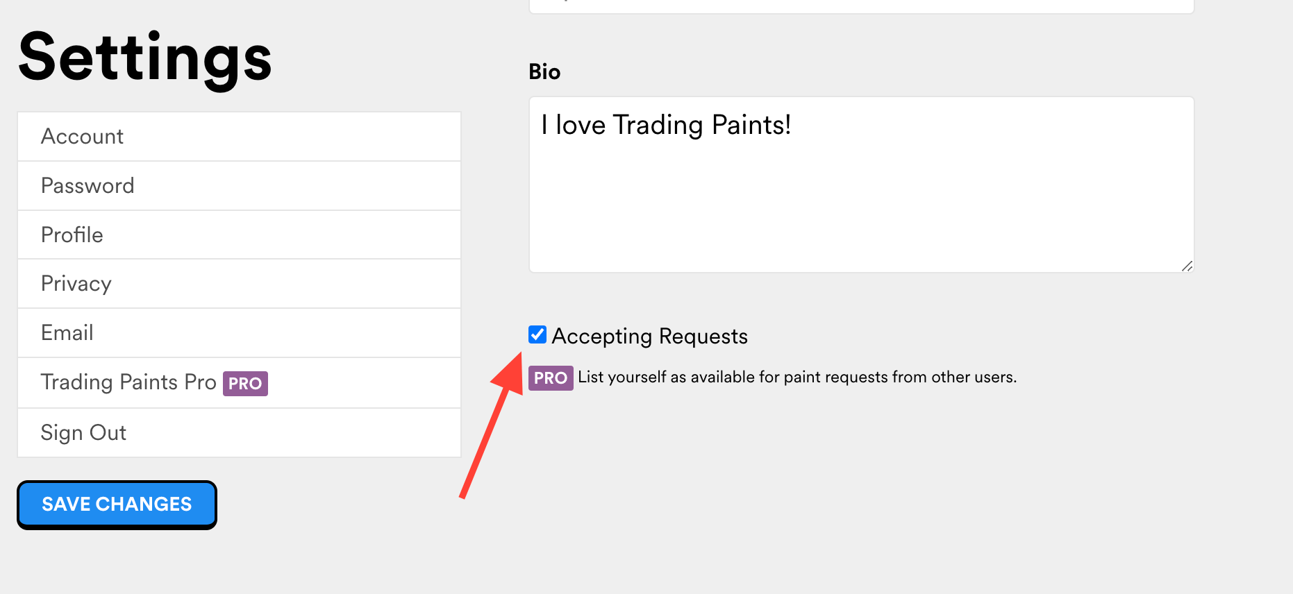 Add a profile pic, cover photo, and bio. If you’re a Trading Paints Pro member and would like to paint cars for other drivers, mark that you’re accepting requests. This will allow other users to message you regarding creating custom paints.