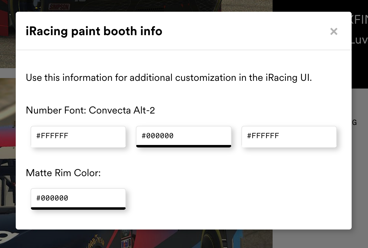 Including info about the number font, number color, wheel rim color, and wheel style ensure drivers who race your paint know how to make their car look the way it was intended when they hit the track.