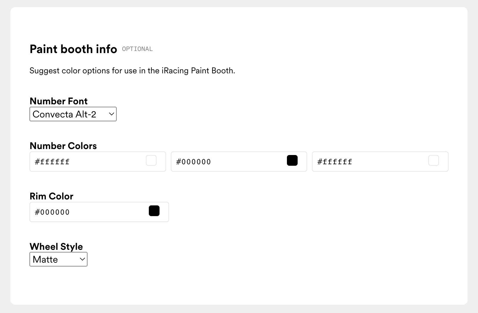 Don’t forget to complete the Paint Booth Info section when submitting your paint to the Showroom. This gives potential racers the info they need — number font, wheel style, and relevant color codes — to complete the look in the iRacing paint booth that matches your vision.