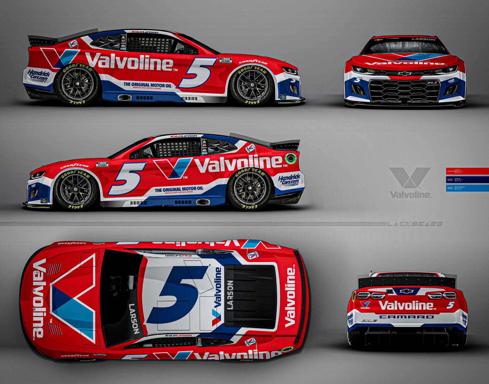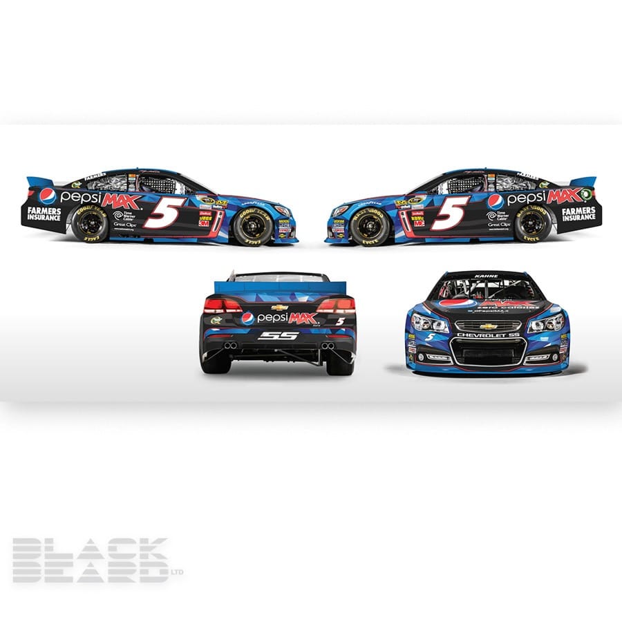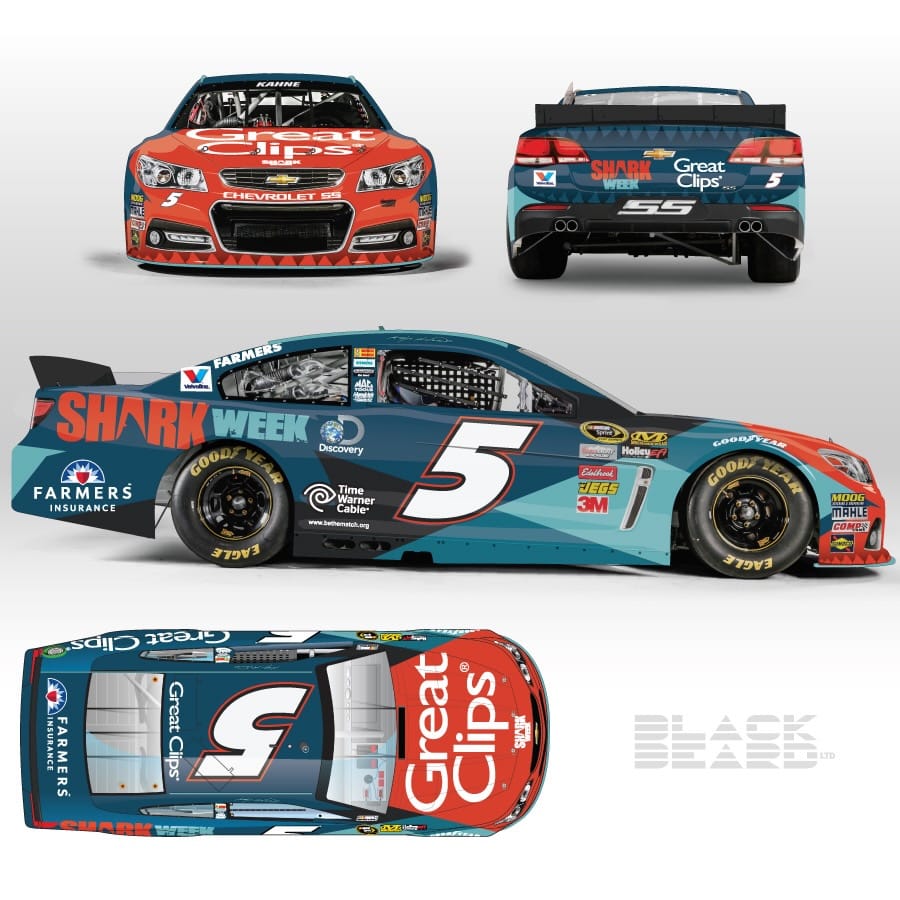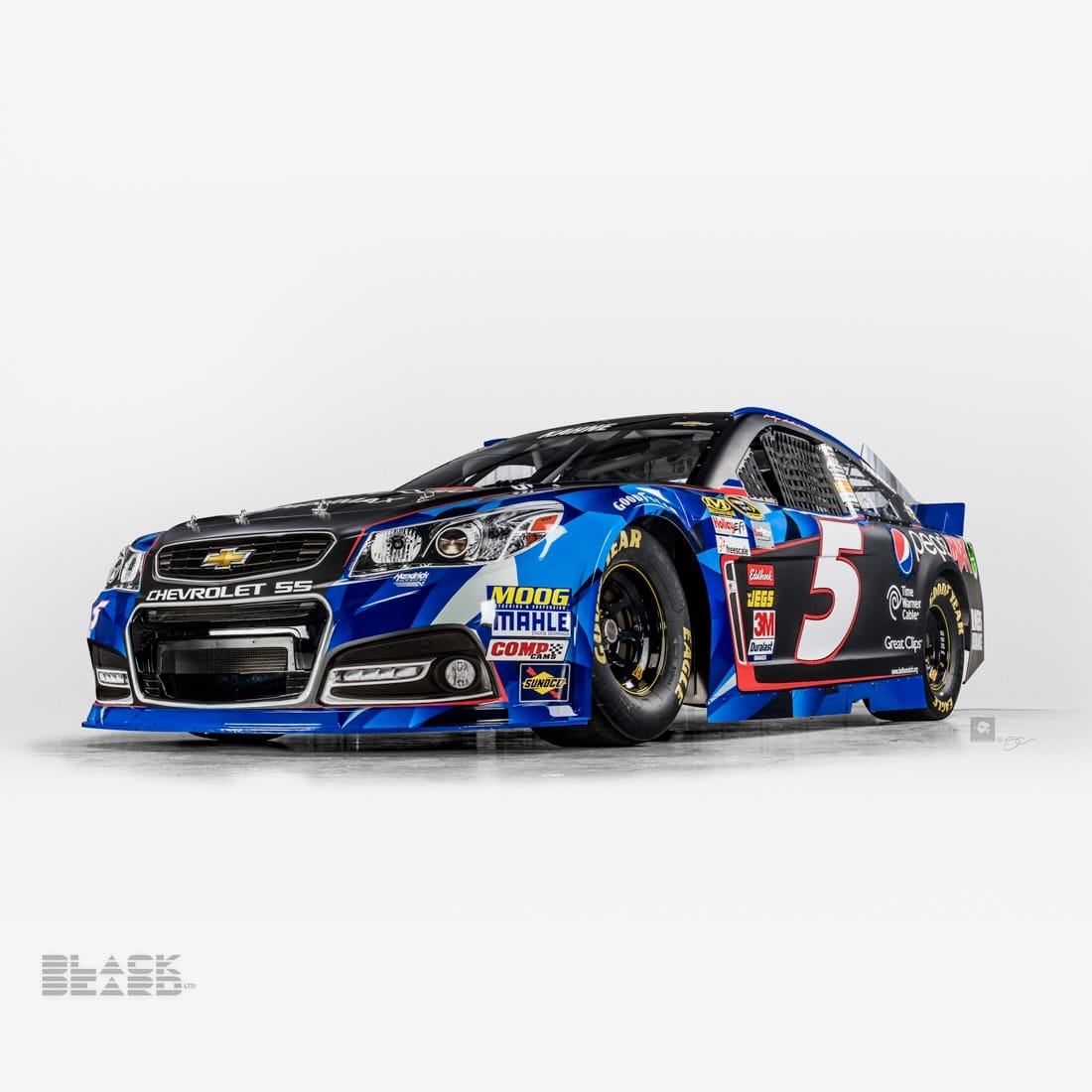 I had to build my own templates and understand the 3-dimensional flow of the car digitally. There were a few major performance-based design changes made near the end of the process that I think degraded the final concept. Once the Indy livery was close, I started on the Cup car, which is much more comfortable design territory for me. I was a little disappointed that the production Cup livery had identical sides which doesn’t work on the No. 5 car as the door numbers don’t change lean, so the No. 5 leans forward on right side of car and rearward on left side of car. My graphics were adjusted on either side to flow with the number.