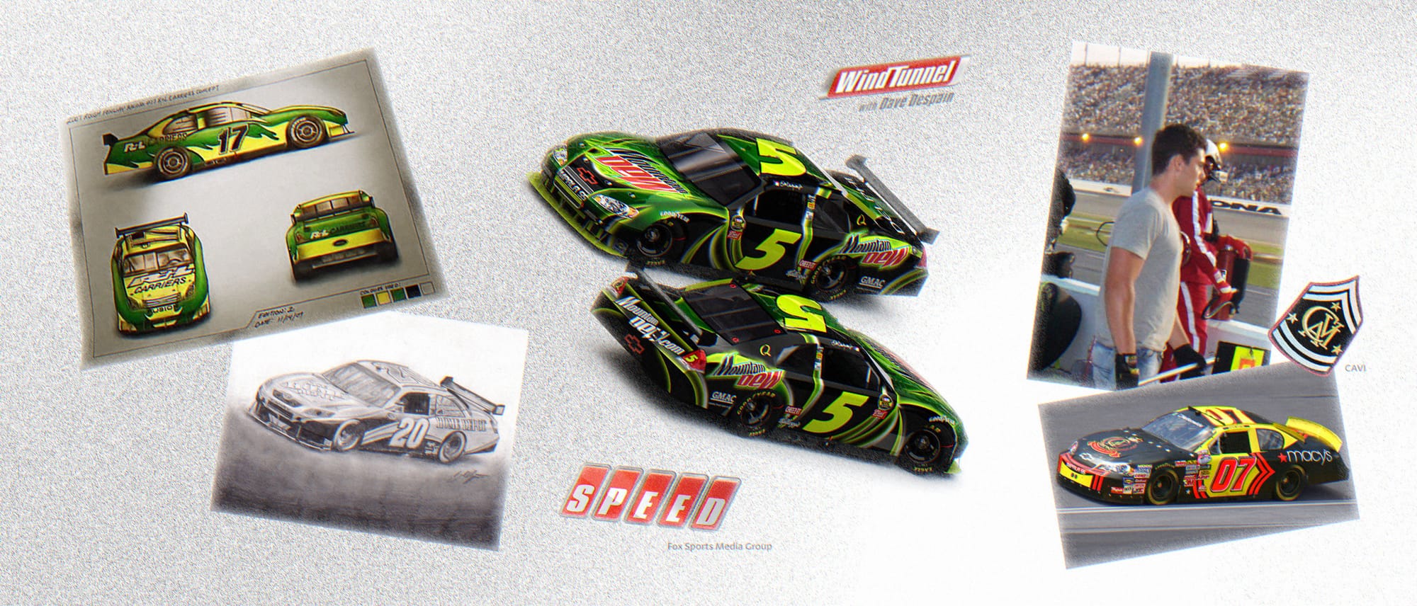During my first summer off from Graphic Design college, I knew I wanted to design NASCAR paint schemes professionally. I then cold emailed and landed a remote internship with Matt Kenseth’s spotter’s company, where I designed my first ever paint scheme for Chase Austin’s No. 07 Cavi and Macy’s Chevrolet in the Nationwide (Xfinity) Series at Daytona. To repay the favor, I brought my father to the other side of the fence to look at it up close, a time we still reminisce on to this day.