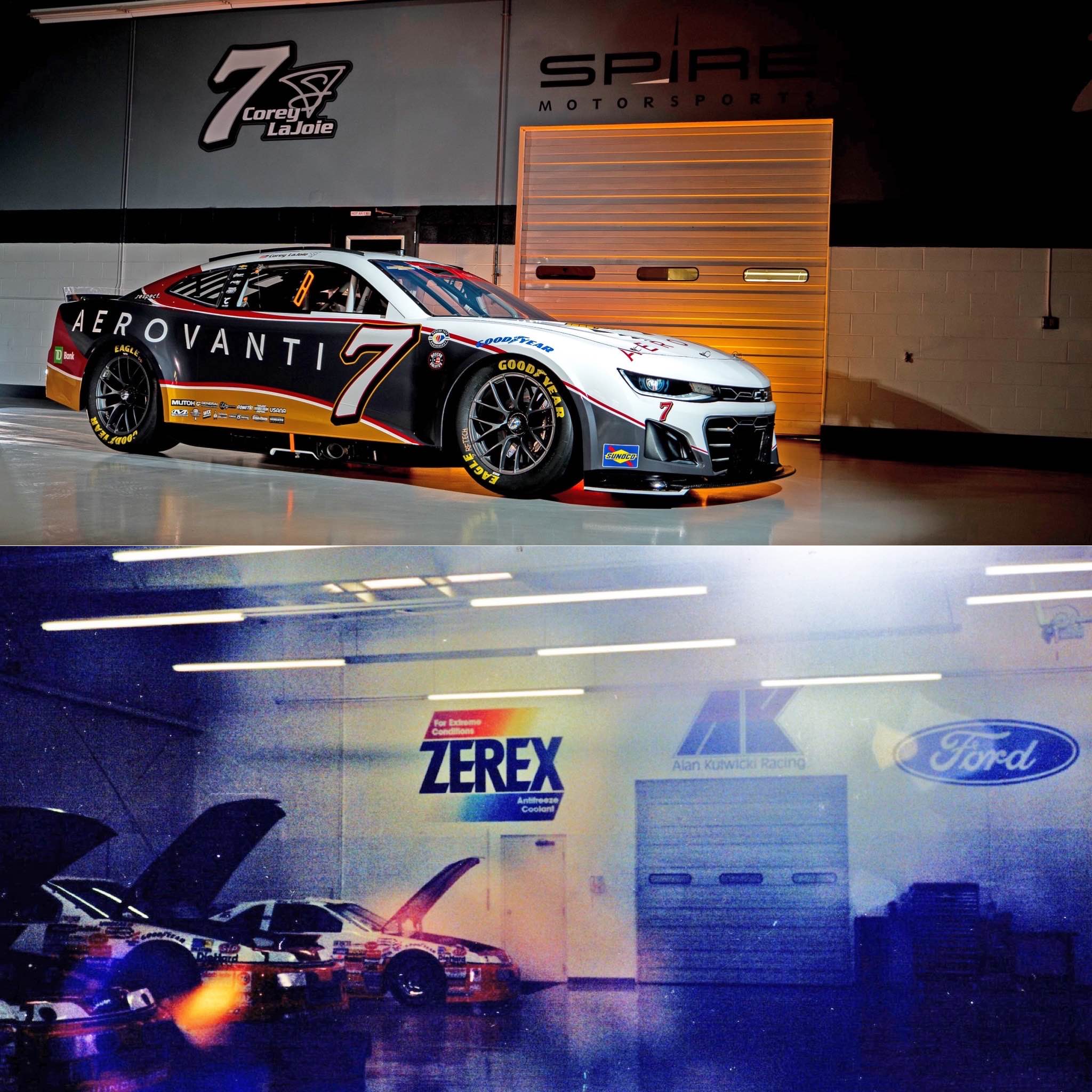 The first one was the Aerovanti scheme that raced at Charlotte in 2023 and Spire had gotten some photos of it in the shop. I ended up coming across some old shop photos from the AK days and everything was pretty much the same except for some new paint on the walls and Spire logos where the AK logos used to be, so that was crazy to compare them.