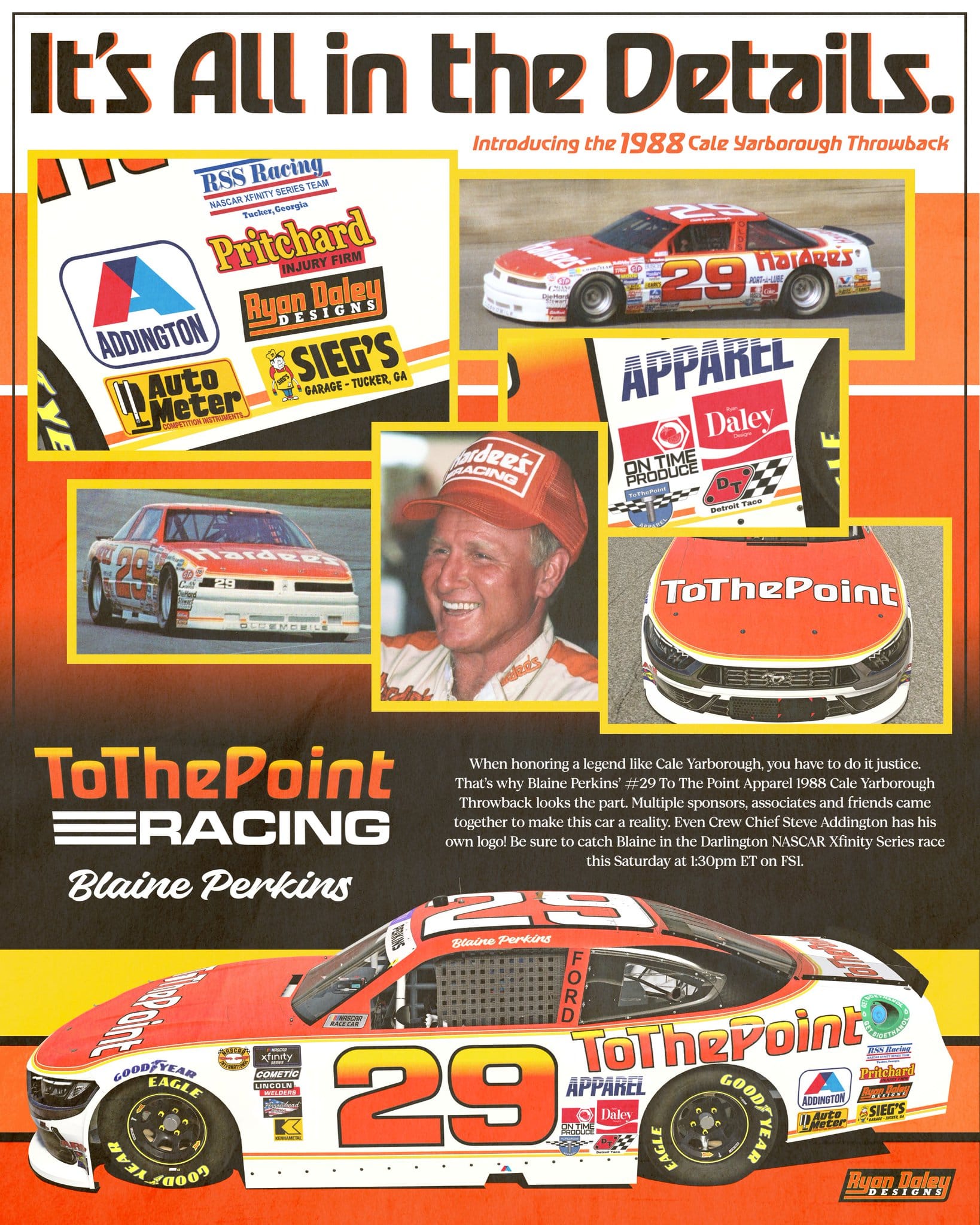 Ryan: Definitely some of the throwback cars from the past few years. The most recent one done for Blaine Perkins, which was a throwback to Cale Yarborough’s 1988 and final Cup car, is a good example. Luckily for this one, enough people came together to be able to recreate every logo that was on the original car, but on the other hand that meant it would be extra time consuming. It is always worth it, though!