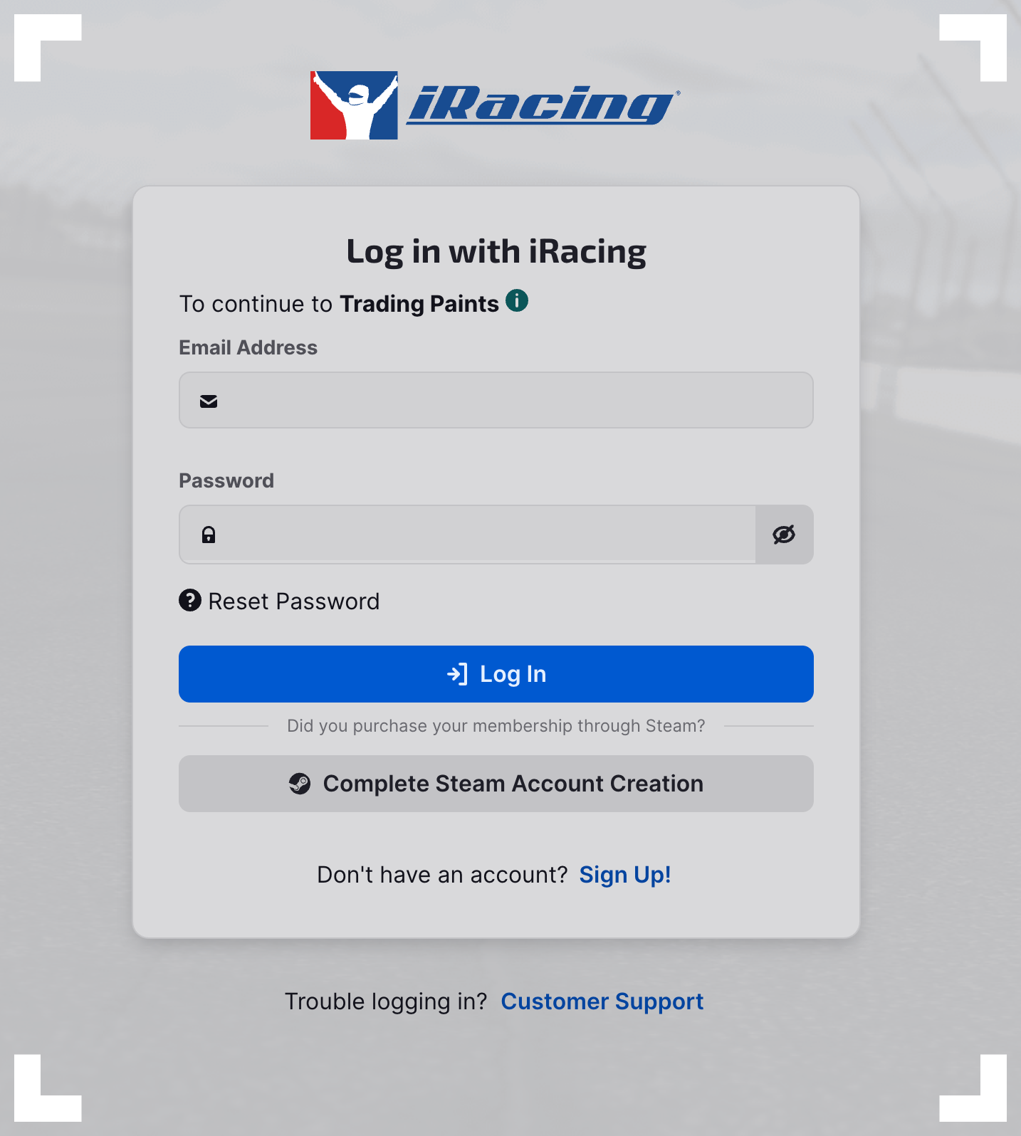 On iRacing’s site, enter your iRacing email address and password — it will say “To continue to Trading Paints” above the form.