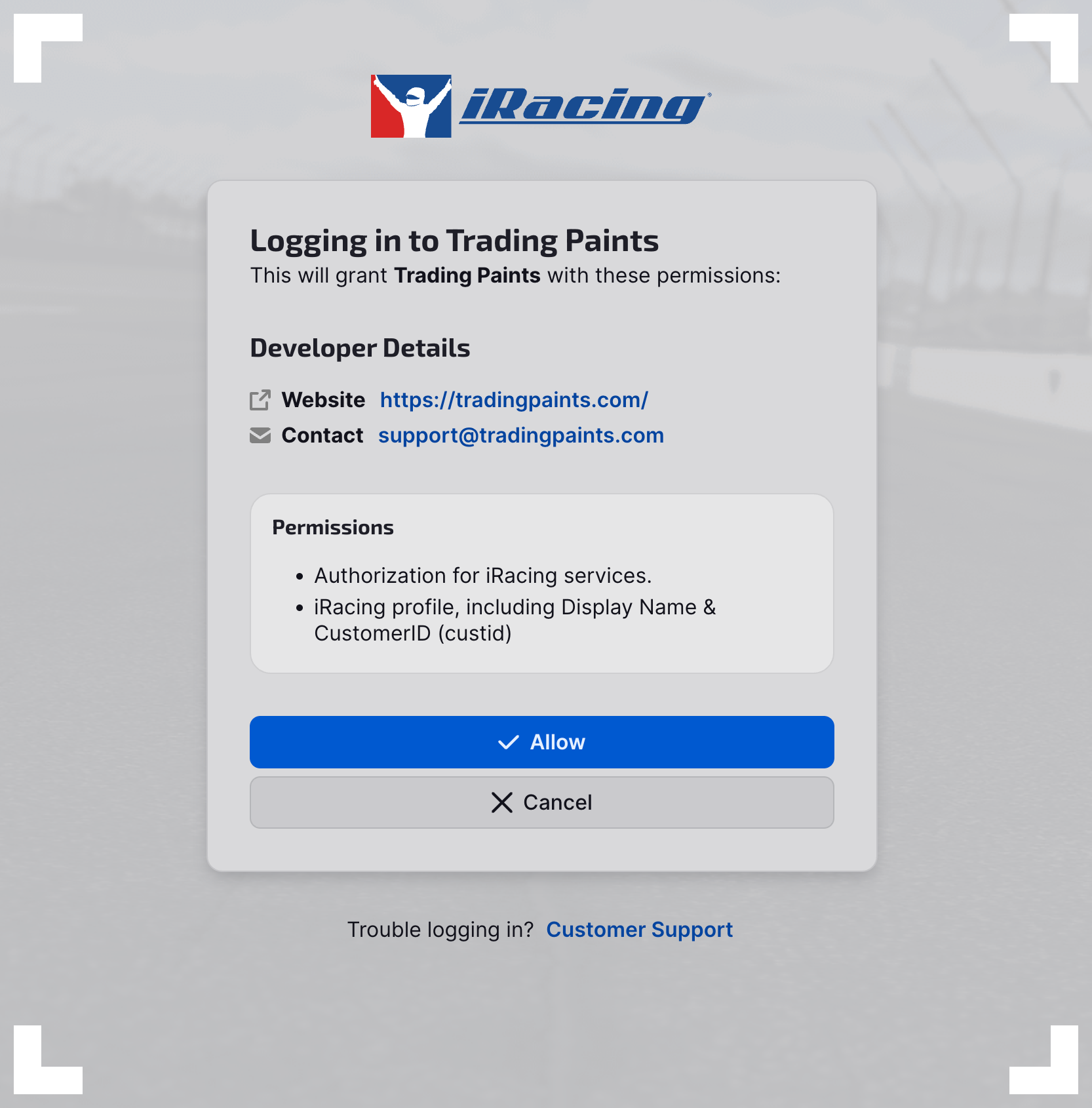 When you log in on iRacing’s site with your iRacing credentials, you’ll be asked to allow Trading Paints to continue.