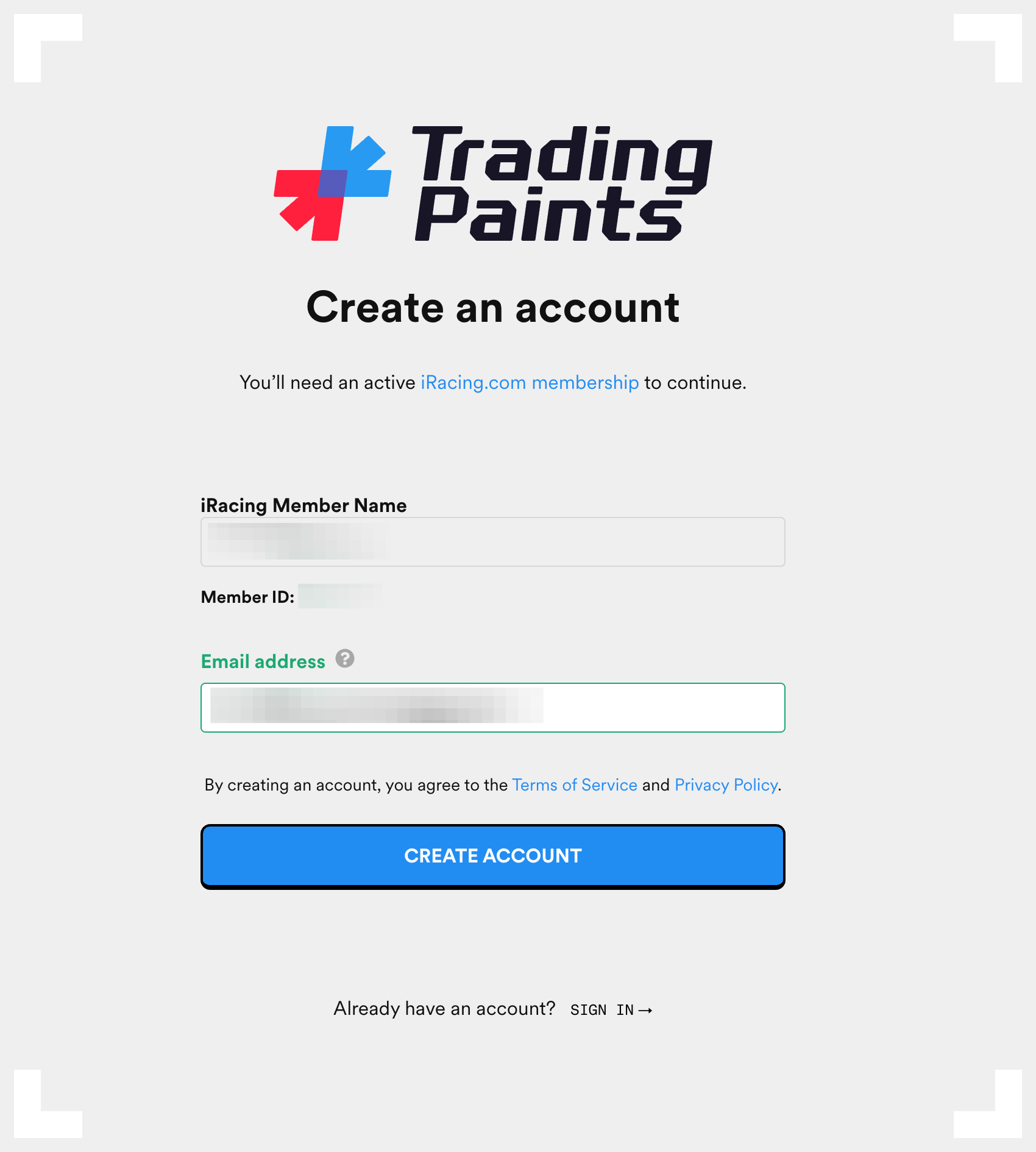 If you already have a Trading Paints account, you’ll be automatically logged in; if you don’t yet have an account, you’ll land on the Create an account screen to continue signing up for your Trading Paints account.