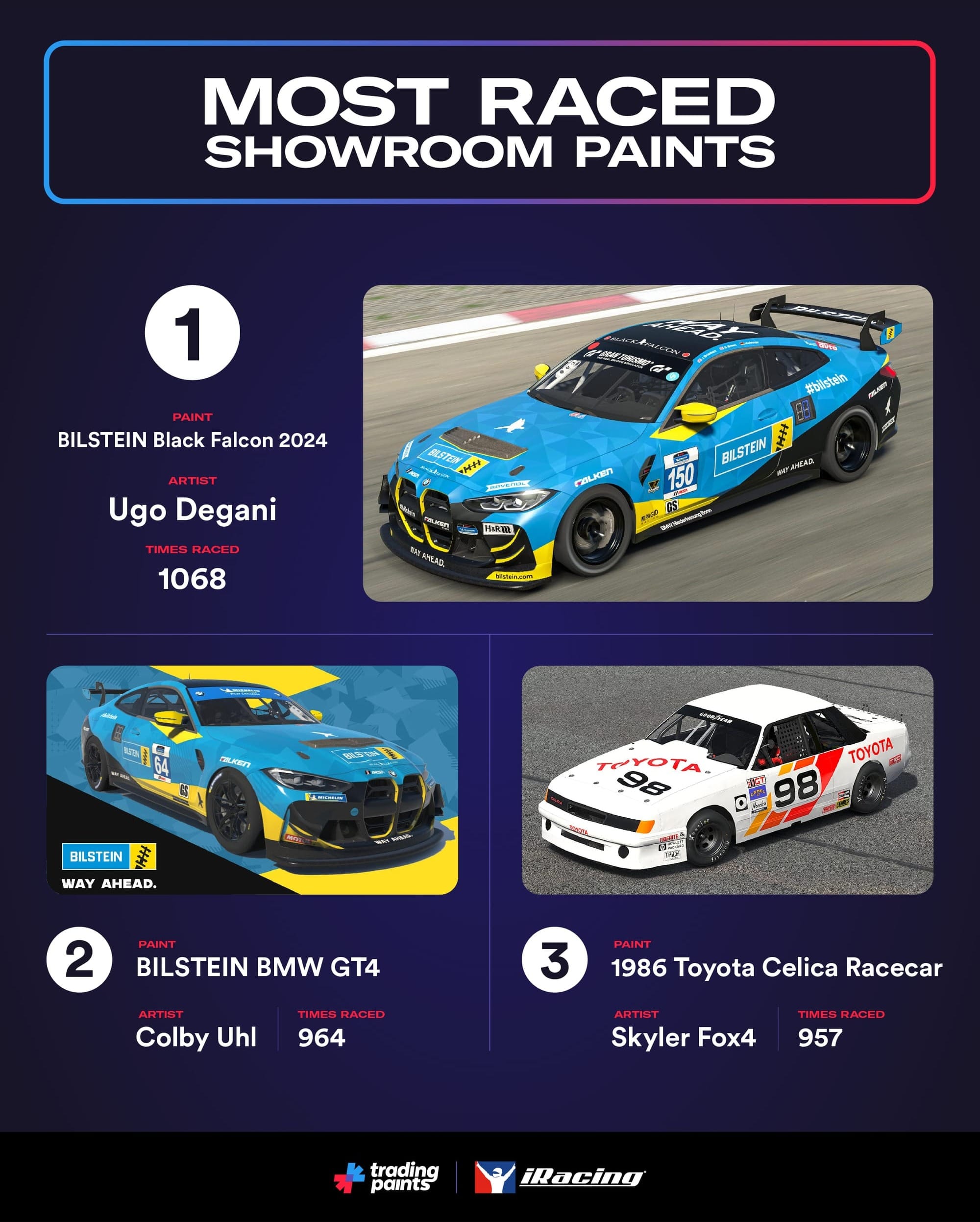 Ugo Degani’s BILSTEIN Black Falcon 2024 BMW M4 G82 GT4 replica took top honors as most-raced Showroom paint in the season, followed closely by Colby Uhl’s take on the same car, driven in the Nürburgring 24 Hours by Jimmy Broadbent, Misha Charoudin, Manuel Metzger and Steve Alvarez Brown (SuperGT). The cars carry a bold blue-and-yellow color scheme with Bilstein sponsorship. That’s a shock. (Sorry, had to.)
