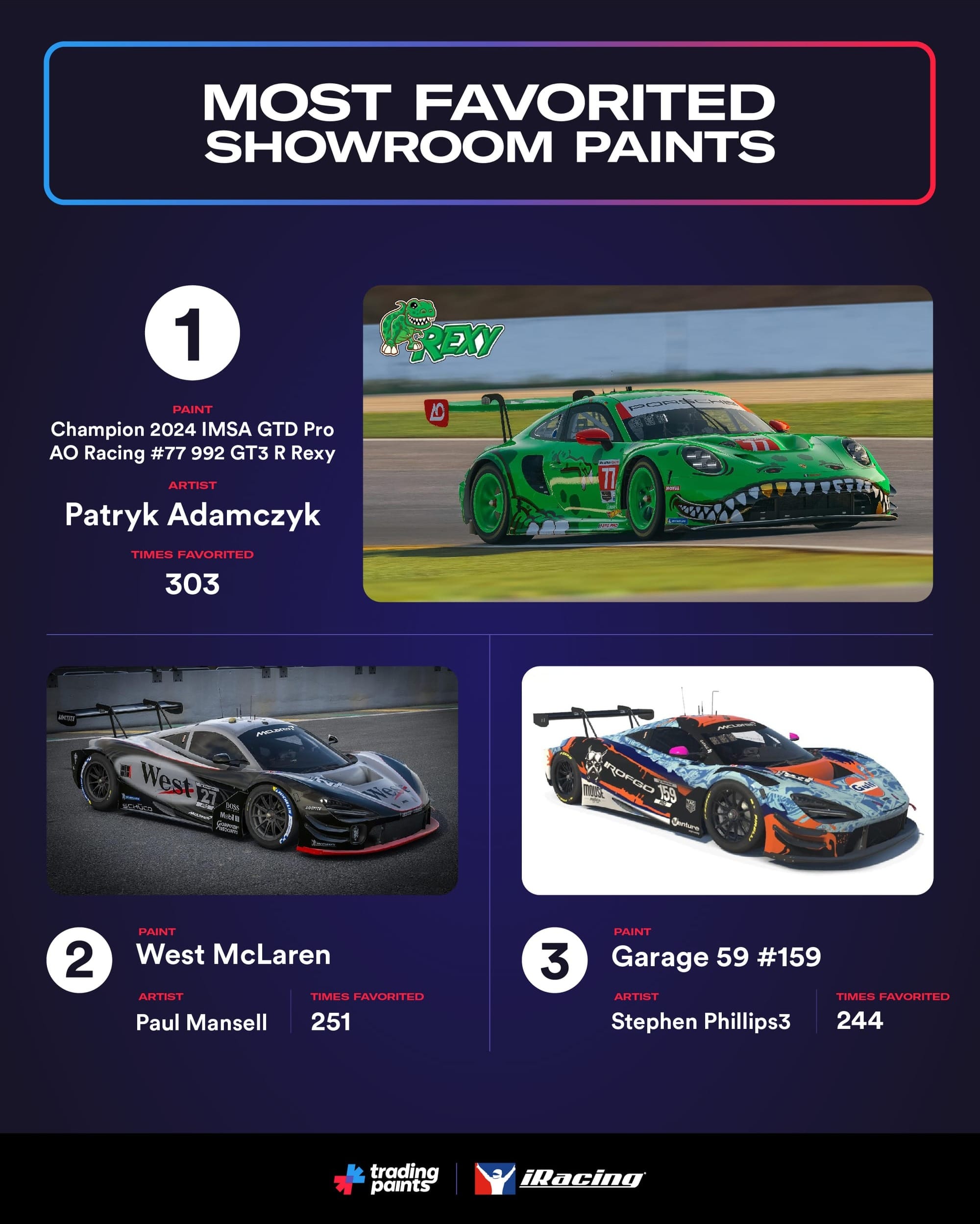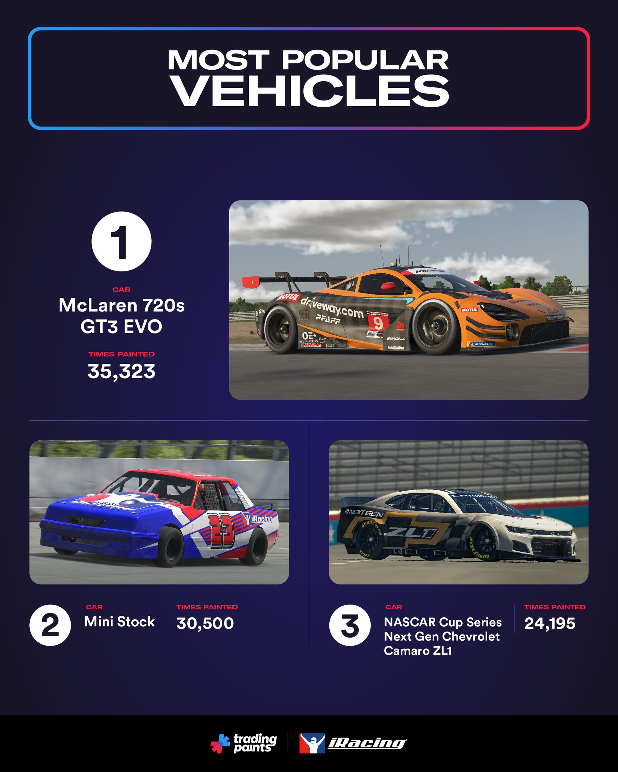 Perhaps unsurprisingly, new cars were the most popular vehicles on Trading Paints again in Season 4. The McLaren 720s GT3 EVO had 35,323 paints assigned, just ahead of the Mini Stock, painted 30,500 times. The good ol’ NASCAR Cup Series Next Gen Chevrolet Camaro ZL1 was third.