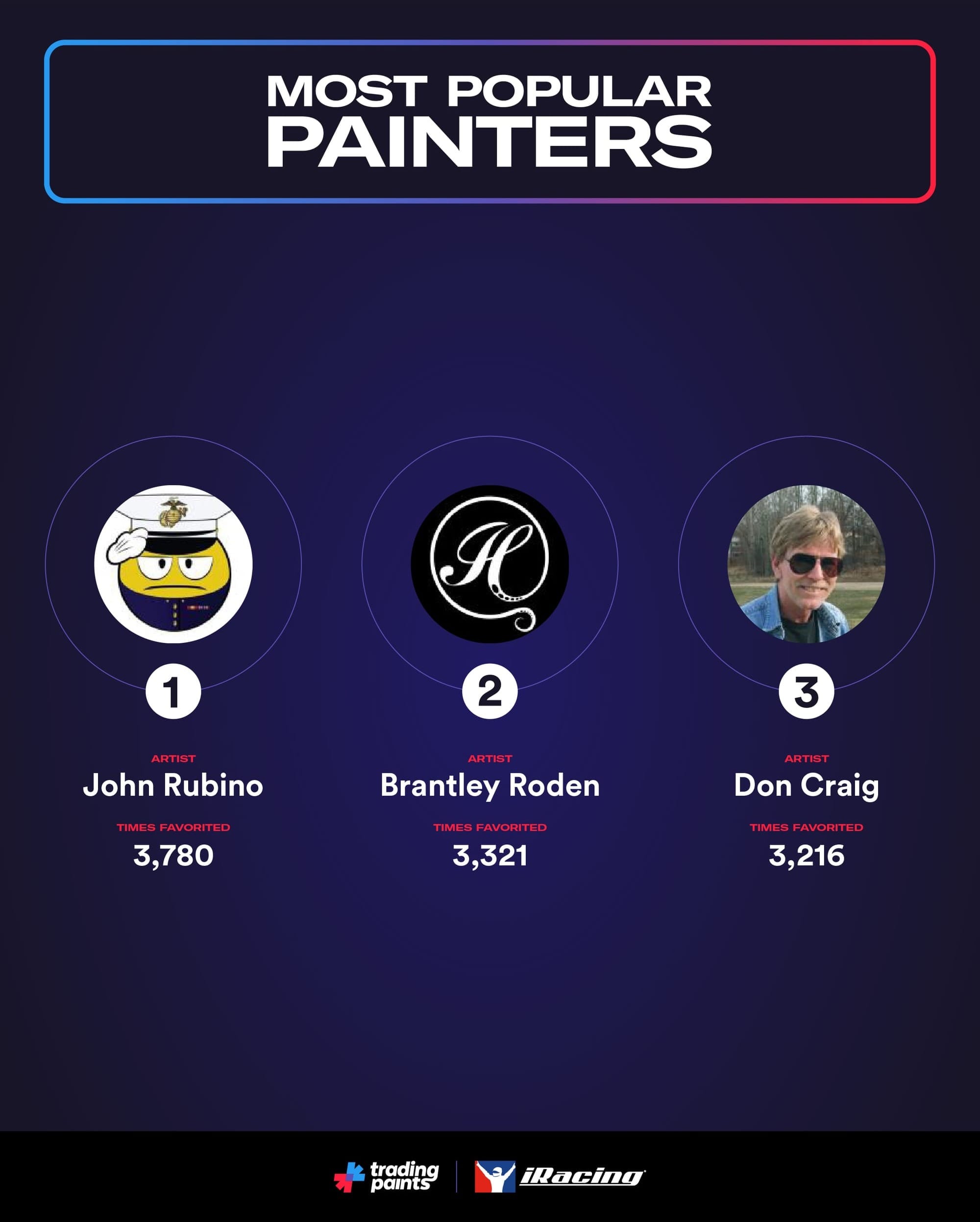 A trio of Showroom veterans were the most-raced uploaders in Season 4. John Rubino backed up his Season 3 success, ahead of oval-racing replica painter extraordinaire Brantley Roden and the ever-creative Don Craig.