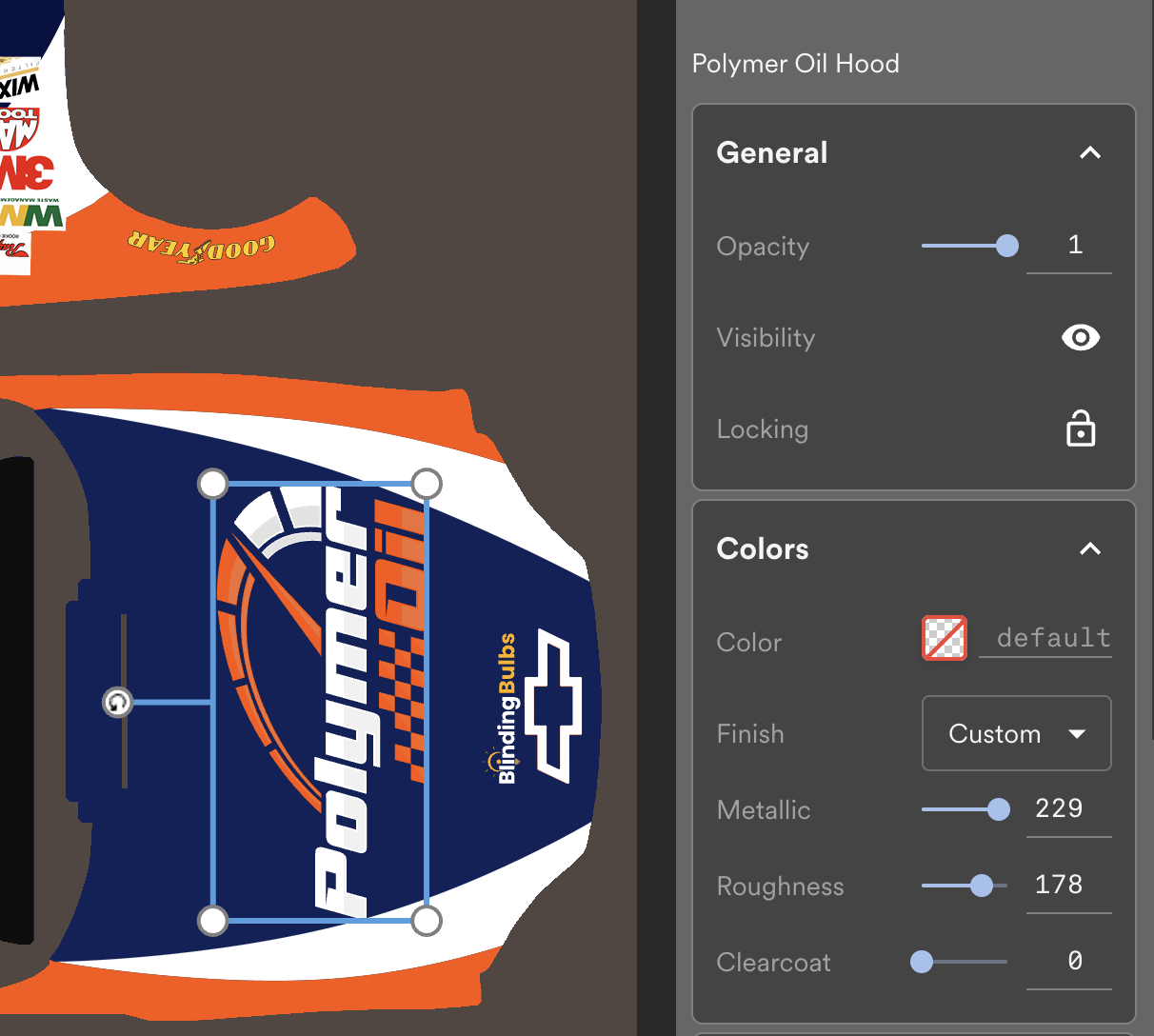 In Paint Builder, after you’ve enabled Finish options, select the desired layer, and in the properties panel under Finish, choose Custom and enter these values: