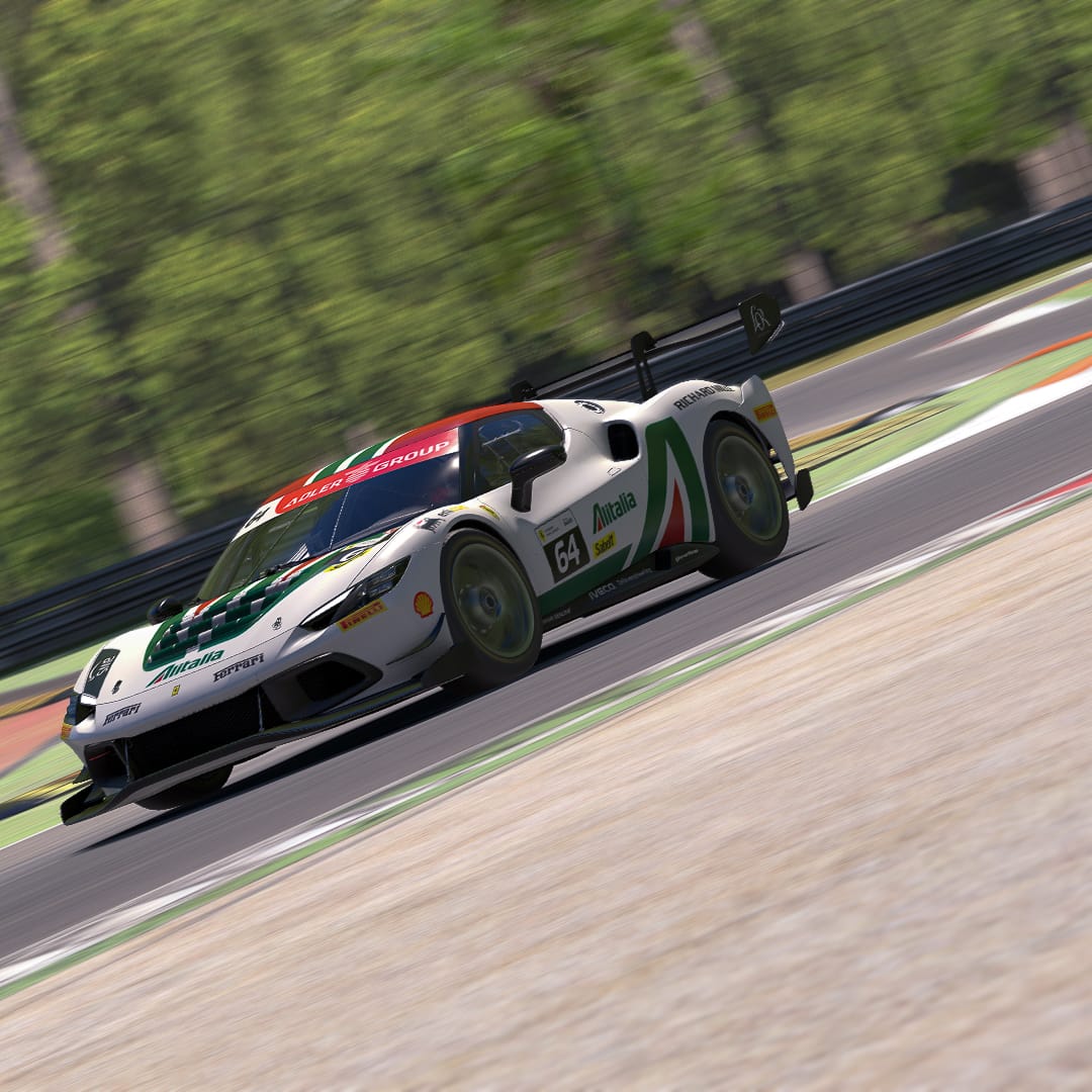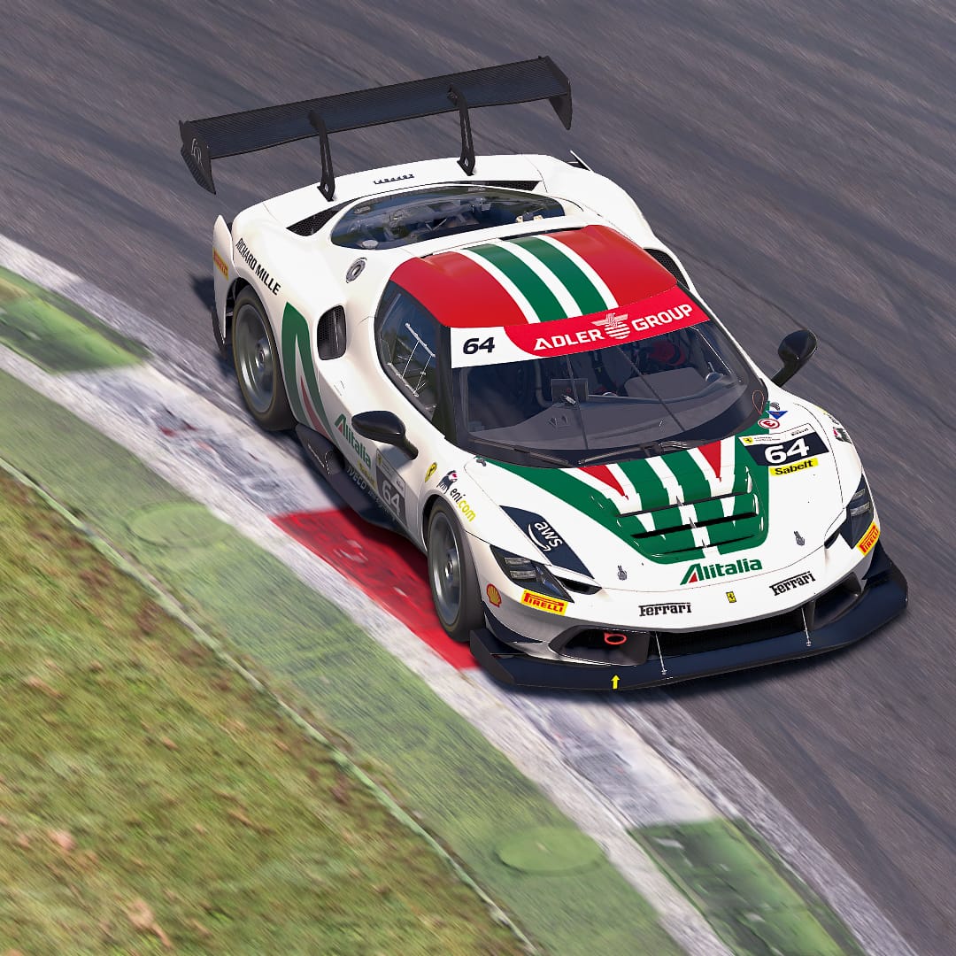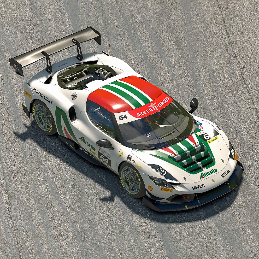 Maris J Hibma shared a lovely Ferrari “inspired by the iconic Alitalia liveries” — painted on iRacing’s newly-released Ferrari 296 Challenge. It’s this week’s Paint of the Week, chosen by Community Manager Patrick.