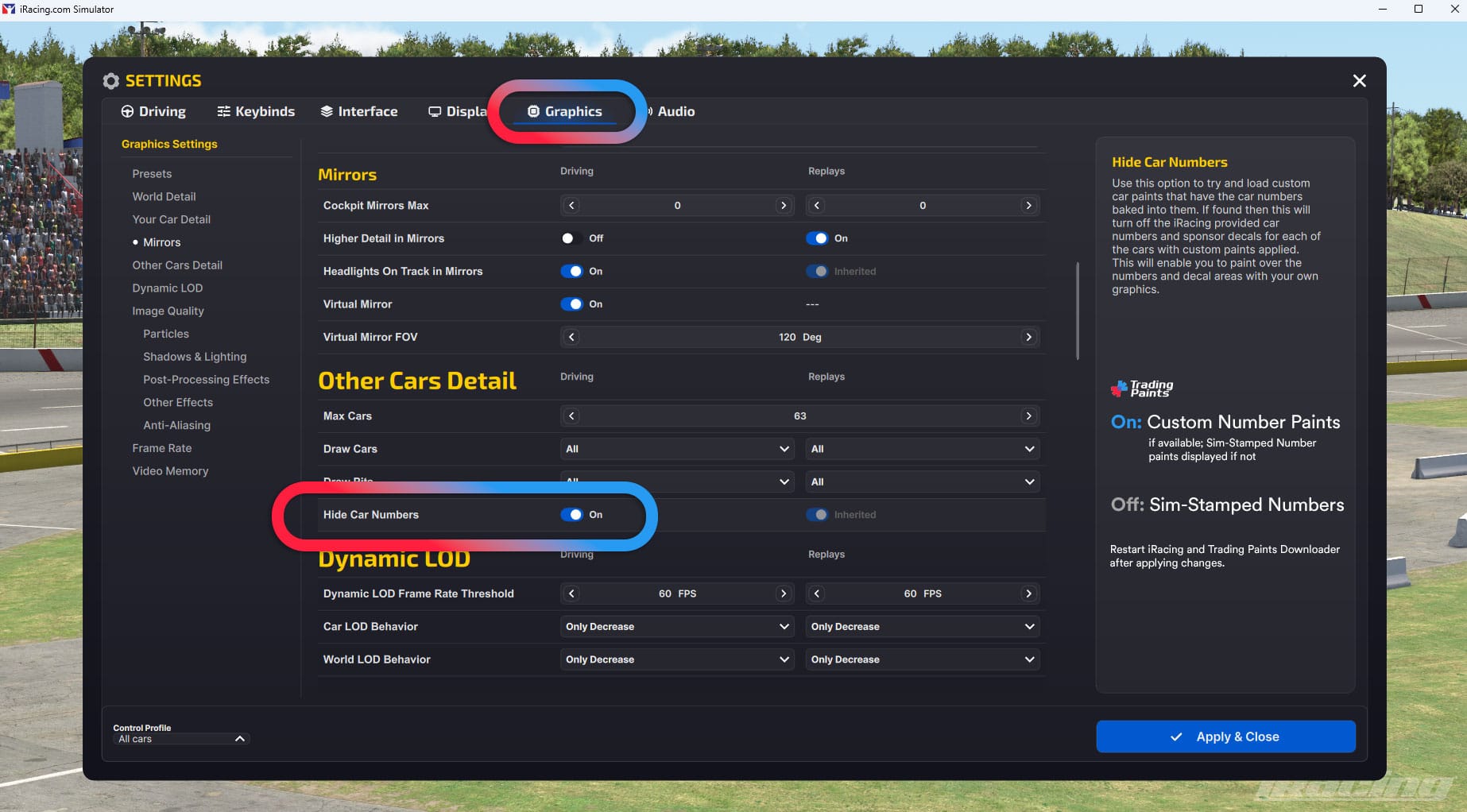 It’s also a good time to check your Custom Number settings in your iRacing graphics options; sometimes, a new build resets options unknowingly. To enable Custom Number paints, while the iRacing sim is running, check Hide car numbers in your iRacing settings under Graphics and restart the sim.